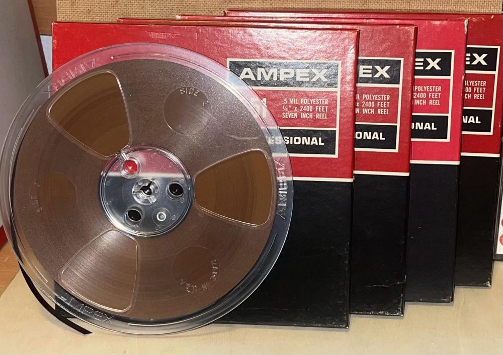 No. 4 bobine Ampex da 18 cm con ciascuna 730 metri di nastro Ampex 651 cancellato e collaudato.
