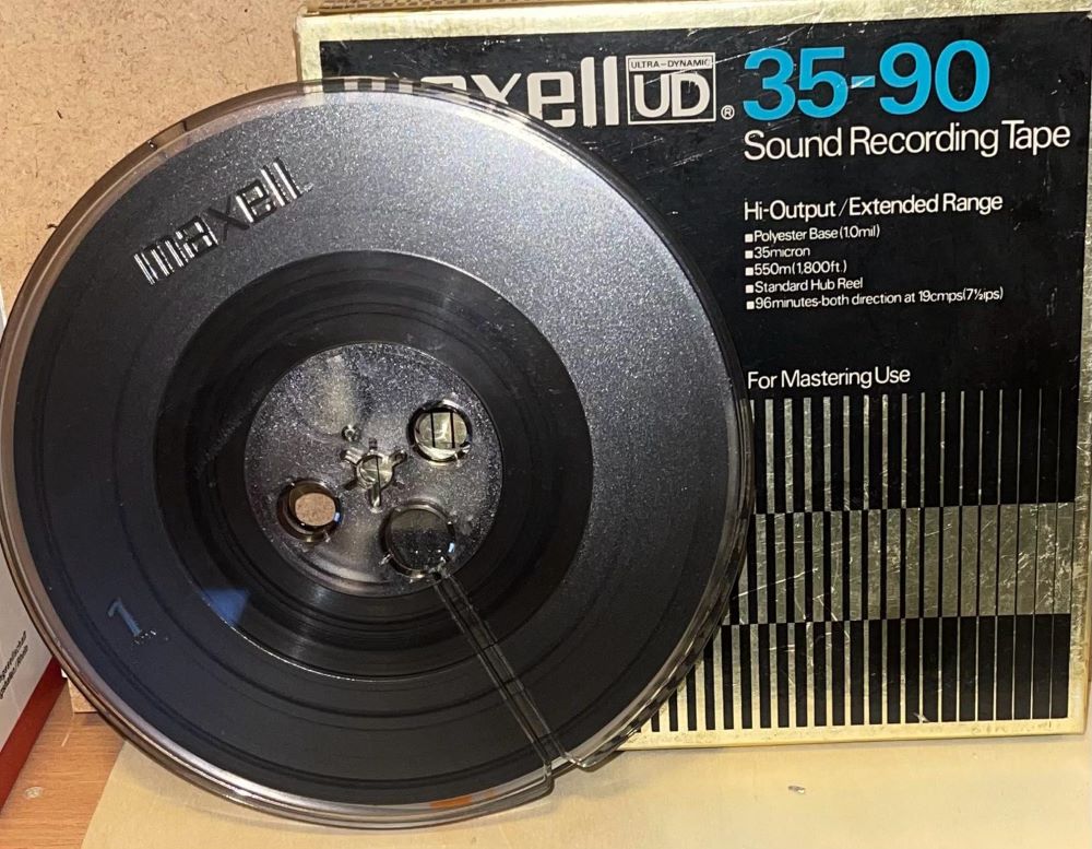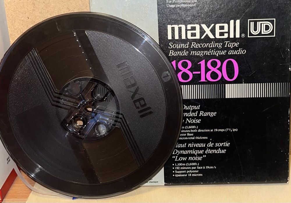 No. 2 bobine Maxell da 18 cm di cui 1 con 1100 metri di nastro 18-180 (2x 94 min. a 19 cm/s) cancellato + 1 con 550 metri di nastro cancellato.