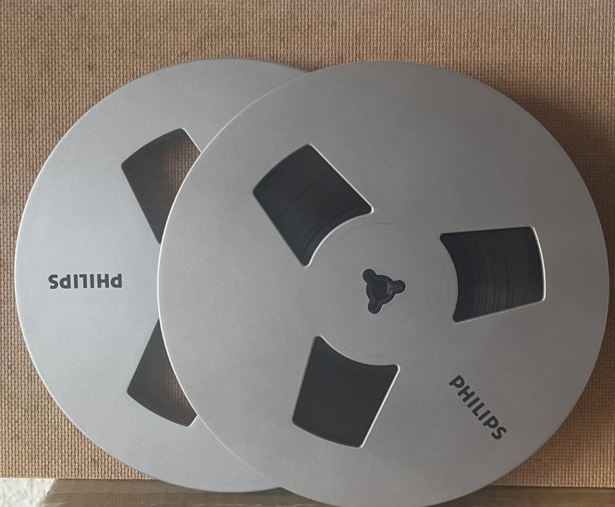 No. 2 bobine aspetto metallo da 18 cm di cui 1 con 730 metri di nastro cancellato + 1 vuota.