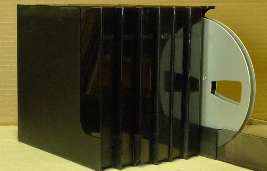 Lotto di 7 custodie BASF con fronte in plexi scuro per bobine la 18 cm. Si dispone di 30 esemplari, tutte in ottimo stato di conservazione. Prezzo: 2,50 € cadauna.